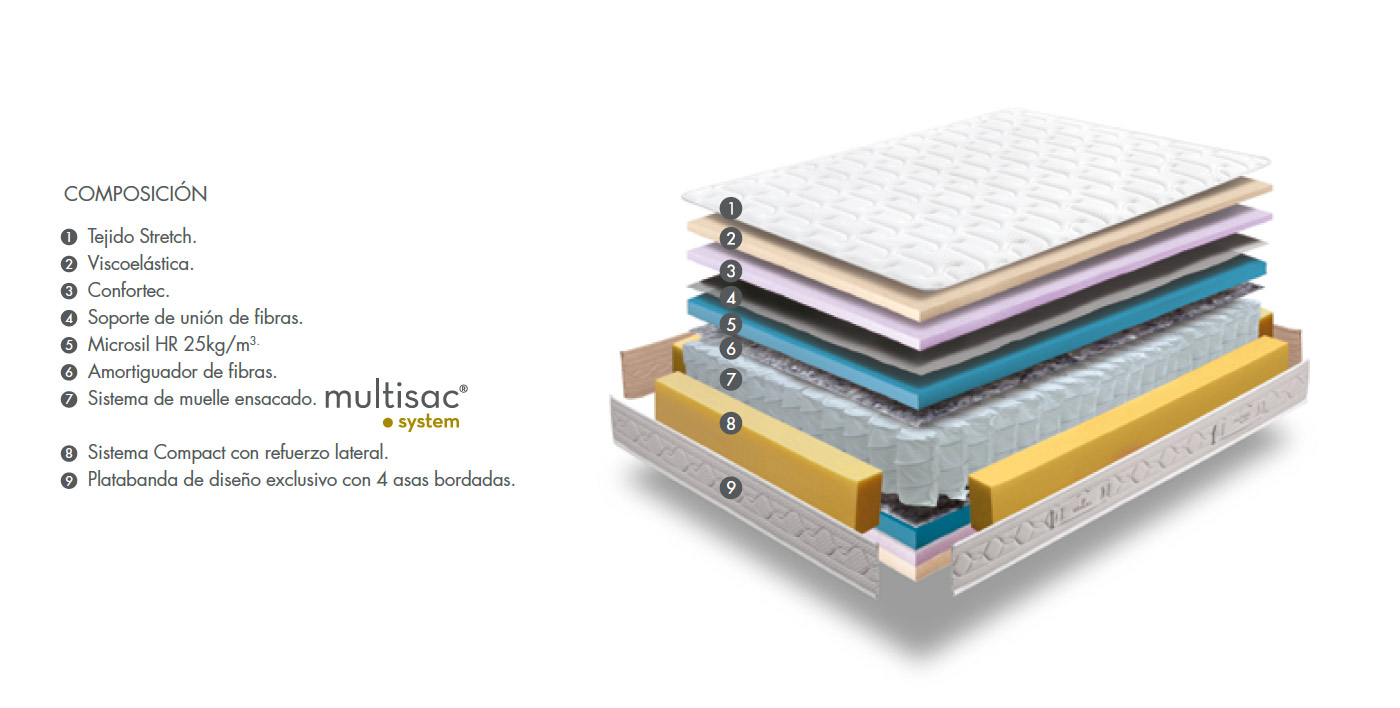 - Multisac System: 500 muelles ensacados. Independencia de lechos. Confort y transpirabilidad. Favorece la circulación sanguínea.