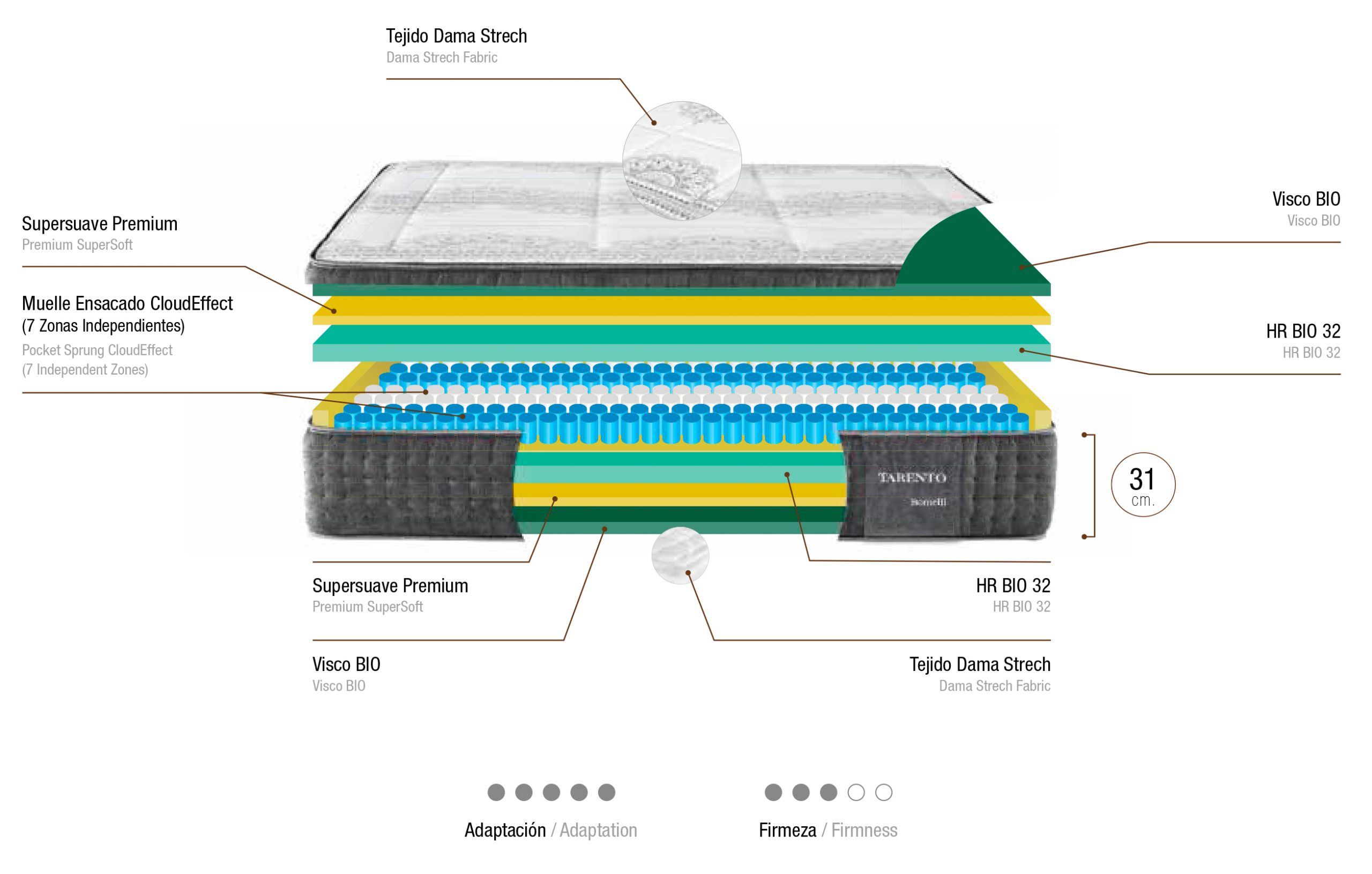 - Tecnología CloudEffect BIO Dispone de 2000 muelles ensacados dispuestos en 7 zonas distintas lo que proporciona transpirabilidad y HR y Visco BIO fabricado con componentes respetuosos con la salud.